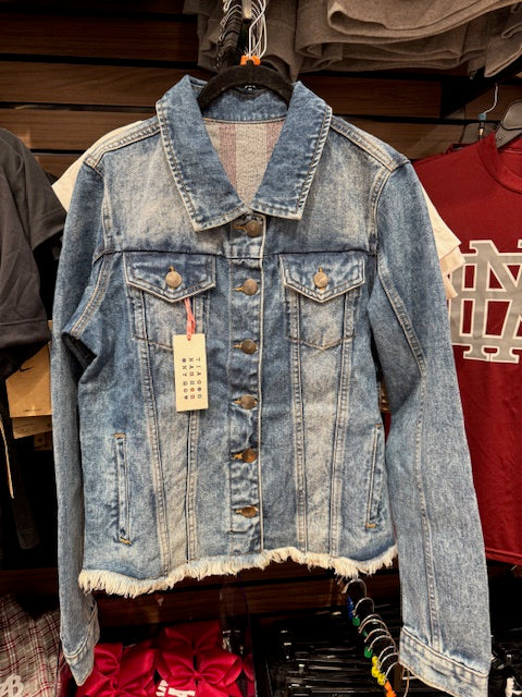 Custom designed frayed edge denim jacket from Tiana NY. Cardinal and white beading on back of denim jacket with our Montgomery Bell waffle and stripe. The jacket has a frayed edge in the front.